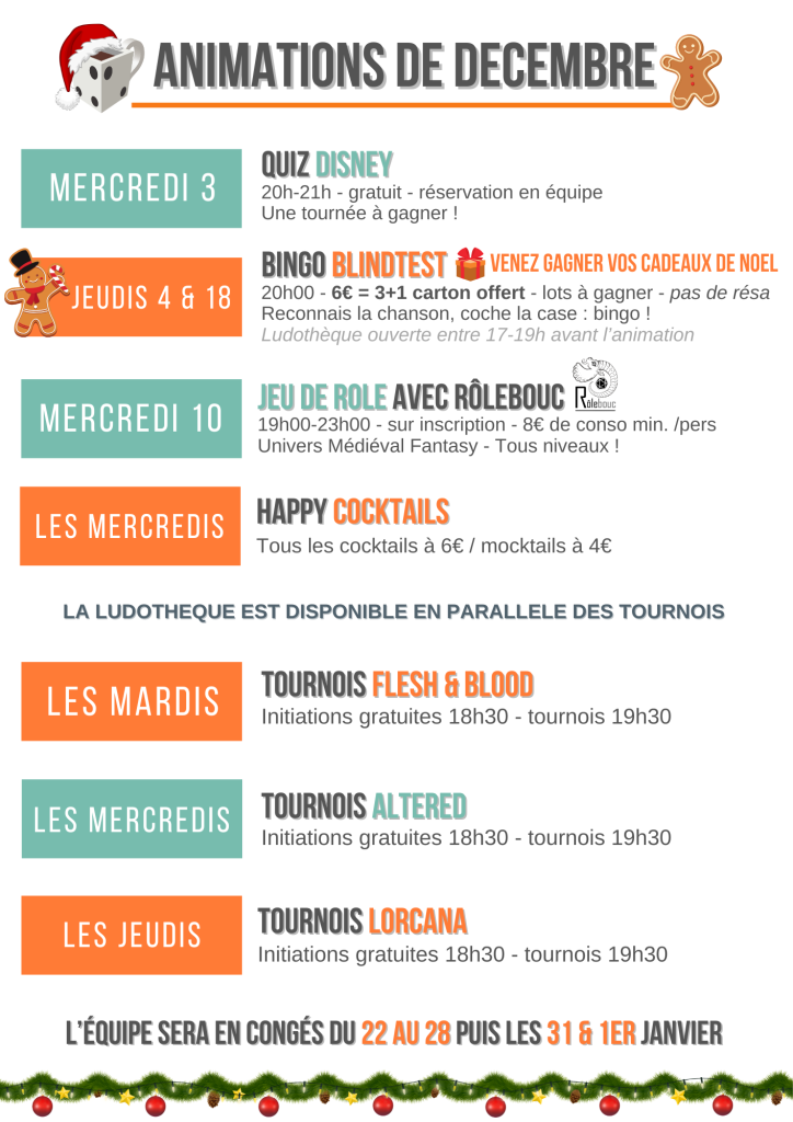 Explorez l'innatendu ! Si vous souhaitez réserver pour aujourd'hui, préférez nous appeler au 05.56.29.19.81 (à partir de 17h) Événement Mercredi 26 novembre - Construit - 6€ Mercredi 3 décembre - Construit - 6€ Mercredi 10 décembre - Construit - 6€ Mercredi 17 décembre - Construit - 6€ Prénom Nom Numéro de téléphone Pseudo altered E-mail Message Envoyer Autres événements: Autres animations Flesh and Blood Rejoignez le discord communautaire ! Discord